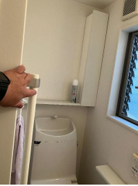 【既設トイレ解体撤去工事】 【トイレ取付工事】 トイレ:リクシル アメージュトイレ ⇒フチレス形状:汚れがたまりにくく、お手入れが簡単。 アクアセラミック:水垢や汚れが付きにくい特殊加工。 節水性能:従来のトイレと比べて大幅に節水可能。 コンパクトデザイン:限られたスペースにも設置しやすい。 トイレ空間が少し狭く感じているため、 後ろの棚などを撤去させていただきオプションの内装工事ですっきりとした空間へ