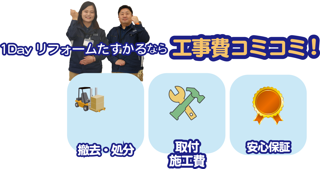 1Dayリフォームたすかるなら、給湯器交換商品、古い商品の廃棄料、工事費まで全部コミコミ!だから予算が立てやすいし、安心です!